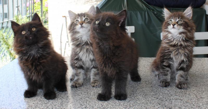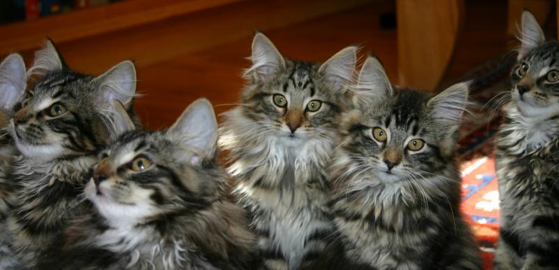 Die Norwegische Waldkatze gehört zu den schweren Rassen und gefällt durch stattliches Äusseres. Bei der kräftigen, schlanken und langbeinigen Katze sind die Hinterbeine länger als die Vorderbeine. Der Kopf hat eine dreieckige Form mit langer Nase, geradem Profil ohne Unterbrechung und kräftigem Kinn. Die hohen und spitzen Ohren sind mit luchsartigen Haarbüscheln versehen. Das wollige und dichte Unterfell wird bedeckt Junge norwegische Wildkatzen Vargtass Zuchtbericht von langem, glänzendem, leicht fettendem Deckhaar. Einzigartig ist die wasserabstossende Eigenschaft des Deckhaars. Da das Fell dieser Katze «pflegeleicht» ist, muss sie nicht so häufig gekämmt werden. Besonders auffällig ist die Halskrause, der Backenbart und die «Knickerbockerhosen» an den Hinterbeinen. Zwischen den Fussballen wachsen Haarbüschel die sogenannten «Schneeschuhe». Der Schwanz ist sehr lang und sehr buschig. Die Norweger gibt es in allen Farben, wie bei unseren Hauskatzen.