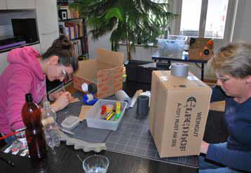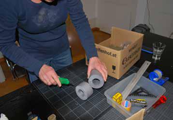 Man kann also allerlei aus dem Haushalt recyceln. Wichtig ist, dass keine Gegenstände mit scharfen Kanten verarbeitet werden. Wenn man alles beisammen hat, macht man am besten auf der Schachtel oder einem Blatt Papier eine Skizze, die aufzeigt, was man wo ausschneiden und reinstopfen möchte.