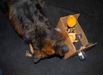 Dafür sind die Spielkisten geeignet: man kann die Leckerli so verstecken, dass daraus für den Hund eine richtige Suchaktion wird, das Versteck noch mit einem Lumpen oder einem Zapfen zustopfen, den der Hund herausholen muss, usw. Der Kreativität sind hier keine Grenzen gesetzt.