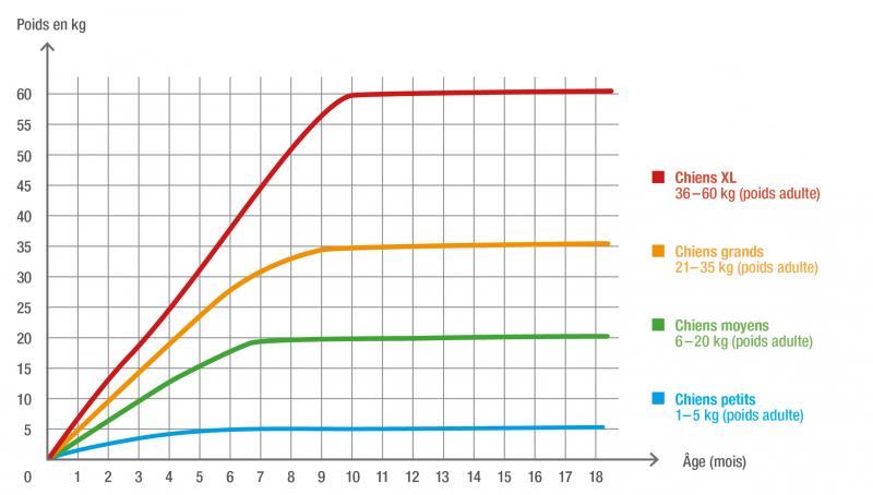 Ne nourissez pas un chien avec des aliments pour chiens adultes avant qu'il n'ait atteint sa pleine maturité. Les petites races sont pleinement développées à environ 10 mois, les races moyennes à 12 mois et les grandes races et les races géantes à environ 18-24 mois. C'est au cours du premier semestre de l'année que l'on observe la plus forte augmentation de poids et de taille. Pour des informations plus détaillées, renseignez-vous auprès de l'éleveur ou de l'association de race sur les stades de croissance du jeune chien.